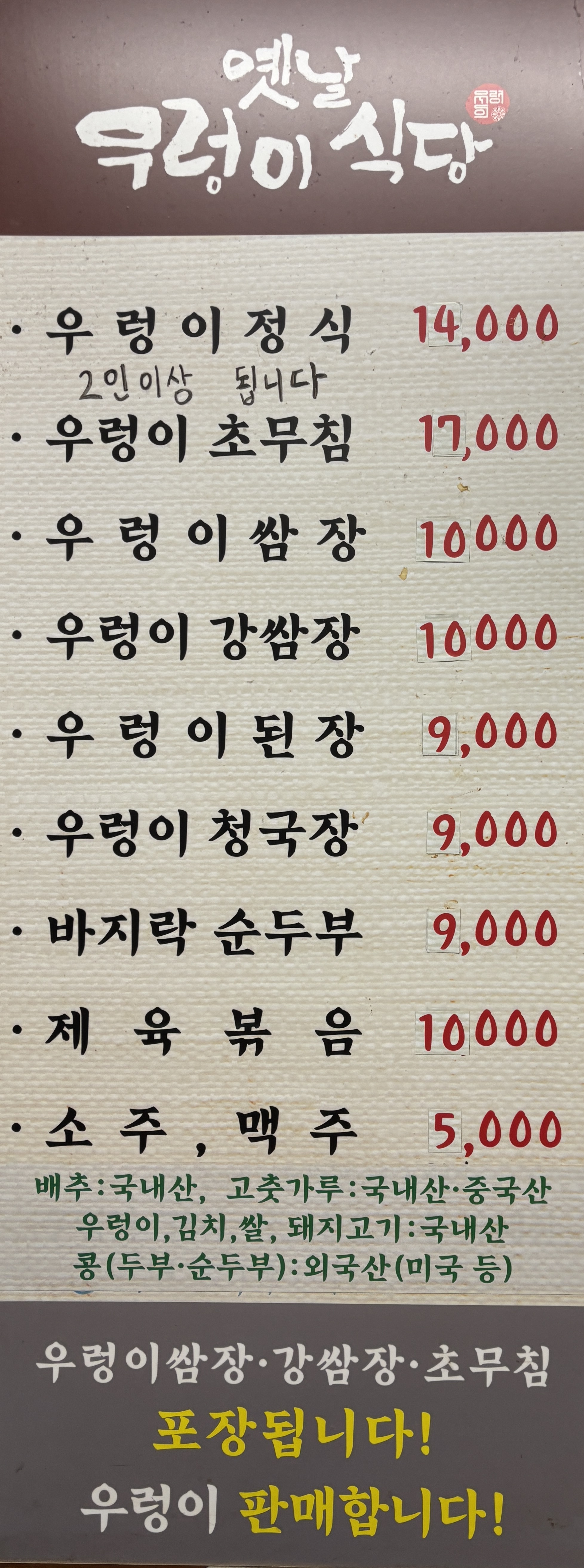 메뉴 가격과 포장 가격은 다르니 포장가격은 물어봐야한다. 초장 가격은 메뉴판에 안나와있다.